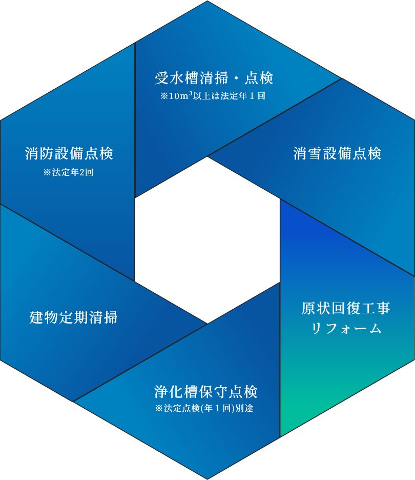 点検や清掃、修繕から原状回復・リフォームまでをまとめてお引き受けし、定額制でわかりやすく、効率的で安定した建物運営をサポートします。